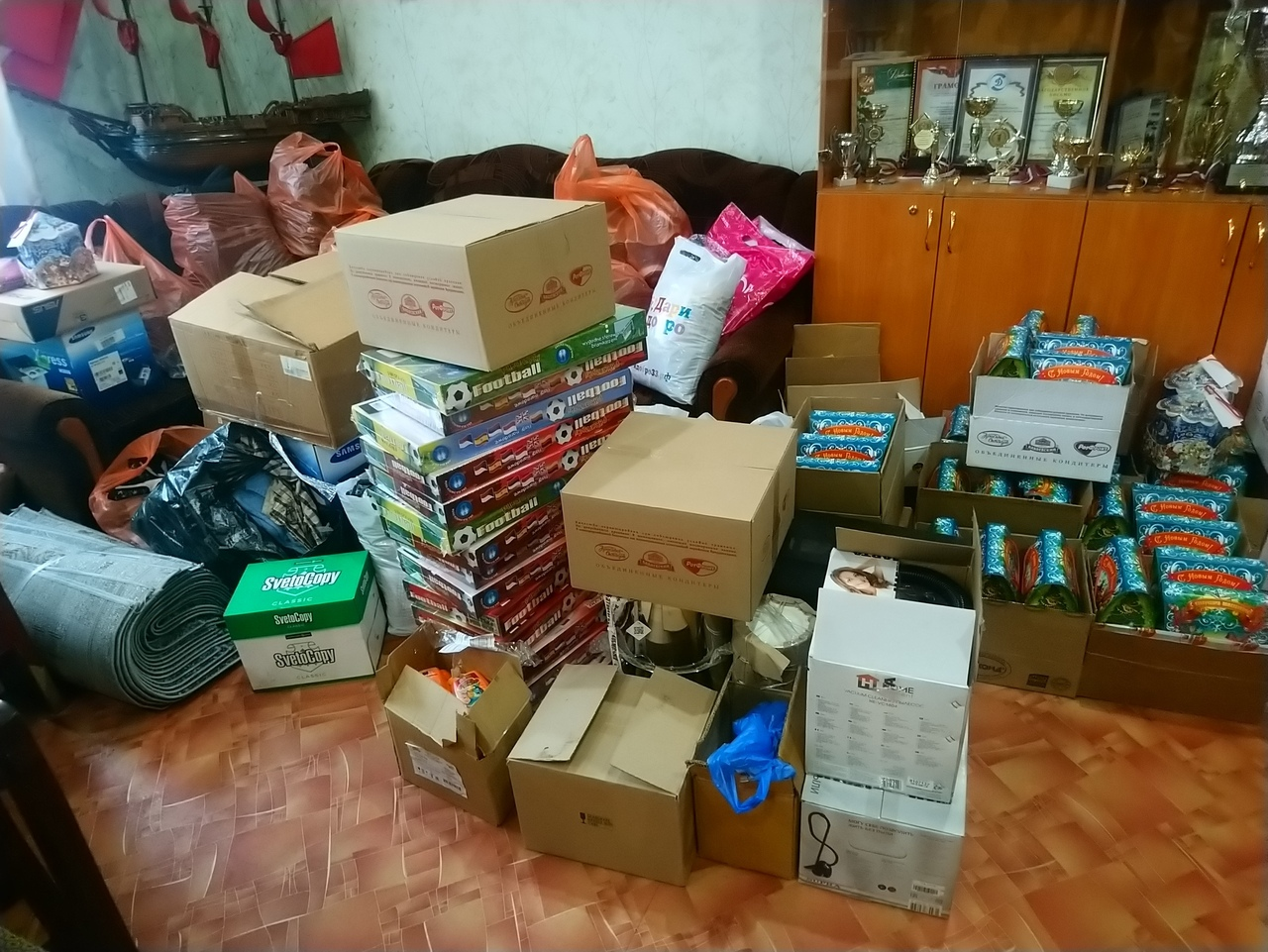 Каждый ребенок получил новогодние сладости и одежду, развивающие игры и наборы для творчества.